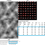 blockwise DCT - wonderfl build flash online JPEG 압축에 쓰이는 discrete cosine transform을 구현했다. 이미지 가로, 세로 길이는 8의 배수라 가정하며 다음과 같이 작동한다. 1. 원본 이미지를 준비한다. 여기서는 간단히 펄린 노이즈를 생성했다. 2. DCT를 수행한다. 3. Quantization을 수행한다. 4. band cutting을 수행한다. 주파수 영역에서 정보가 손실될 때 복원률을 알아보기 위한 단계다. 5. IDCT를 수행한다. 6. 원본 이미지, 주파수 이미지, 복원 이미지를 화면에 그린다. DCT 이미지에 마우스를 올리면 마우스가 있는 블록의 주파수 값을 볼 수 있다. 이미지를 8x8 블록들로 나눠서 DCT를 수행하기 때문에 대응..